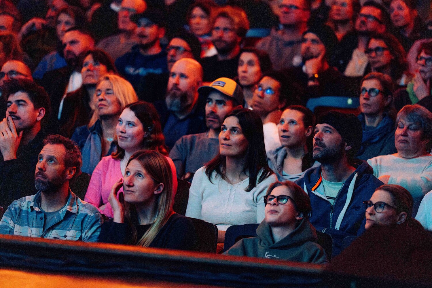 Lachende Zuschauer in einem Veranstaltungssaal, konzentriert auf ein unterhaltsames Filmevent.